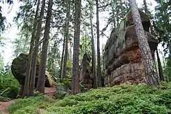 Są to formy skalne o bardzo wymyślnych kształtach, wznoszące się niemal pionowymi ścianami[1]. Wraz z filarami skalnymi tworzą ciąg piaskowcowych baszt, filarów, fantazyjnie ukształtowanych skał w postaci okazałego muru skalnego o wysokości dochodzącej do 100 m. Poszczególne skały lub ich grupy porozdzielane są stromymi żlebami, labiryntami, tunelami i głębokimi szczelinami[1]. Na skałach wykute są pamiątkowe napisy Śląskiego Towarzystwa Leśnego z I połowy XX wieku.
