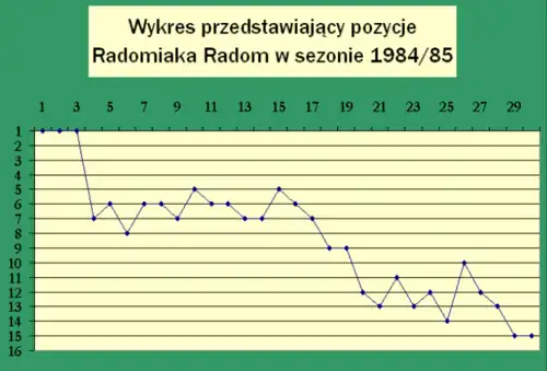 Sezon 1984/1985 był dla Radomiaka Radom debiutem w ekstraklasie. Drużyna od 2 lat prowadzona była przez Józefa Antoniaka i Jura Zielińskiego. W poprzednim sezonie wywalczyła mistrzostwo grupy wschodniej II ligi, uzyskując awans do najwyższej klasy rozgrywek. Przez 3 pierwsze kolejki I ligi Radomiak utrzymywał pozycję lidera, a na zakończenie rundy jesiennej zajął 5. miejsce, nie przegrywając ani razu na własnym boisku. Z kolei wiosna okazała się słabsza w wykonaniu Zielonych. Mimo wygranej 5:1 z Górnikiem Wałbrzych w ostatniej serii spotkań, rozgrywki ukończyli na 15. miejscu i zostali zdegradowani do II ligi. Zgromadzili tyle samo punktów co Śląsk Wrocław, ale drużyna z Dolnego Śląska miała lepszy bilans bramkowy, dzięki czemu została w ekstraklasie.