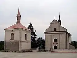 Kościół parafialny pw. św. Kazimierza. Poprzedni, prawdopodobnie parafialny, istniał w XVI wieku. Przed 1595 zamieniony na zbór kalwiński, odebrany w 1715. Obecny kościół został wzniesiony w 1758, konsekrowany w 1794 przez bpa Jana Kantego Lenczowskiego. W 1831 w czasie burzy kościół został uszkodzony (remont w 1837). W 1923 dobudowano od strony południowej kamienną kruchtę. Pokryty blachą w 1928. Położony na cmentarzu otoczonym starym murem oraz (niegdyś) wieńcem starych lip. Odnawiany w latach 1995-2000.