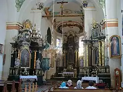 Rokokowe ołtarze wykonano przed 1792, być może przez stolarza Wawrzyńca Bieleckiego. Ołtarz główny (odnawiany w 1923), wypełniony jest rzeźbami śś. Doroty, Jakuba i aniołów oraz obrazem św. Kazimierza, na zasłonie eksponowany obraz Najświętszego Serca Pana Jezusa (1928 r.) z nierozpoznaną sceną męczeństwa w zwieńczeniu. Lewa część ołtarza przy tęczy posiada rzeźby św. Jana Chrzciciela, św. Karola Boromeusza i aniołów oraz obrazy, św. Michała Archanioła, św, Agnieszki na zasuwie i św. Rodziny w zwieńczeniu (praca z 2. poł. w. XVIII) prawa przy tęczy z rzeźbami Aarona i Mojżesza i obrazem MB Różańcowej.
