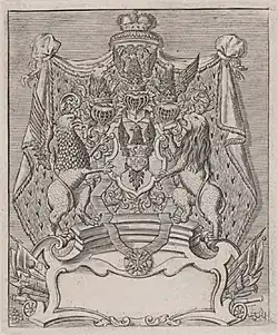 Nad tarczą trzy hełmy z klejnotami w koronach. W klejnocie I orzeł czarny zwrócony wprost, z głową, cieniem i z koroną złotą. W klejnocie II pół lwa złotego. W III pół gryfa złotego.