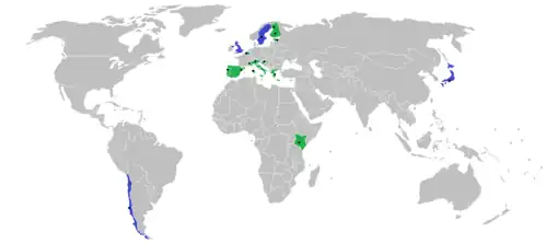 Mapa przedstawiająca kraje w których są planowane rundy WRC w roku 2021 (zaznaczone na zielono) i rundy, które zostały odwołane (zaznaczone na niebiesko).