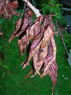 - podczas jesiennego opadu liści, oraz wiosną w fazie nabrzmiewania pąków opryskuje się drzewa środkami miedziowymi[4].