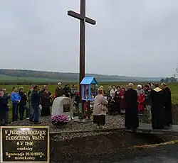 Krzyż przydrożny wzniesiony przez osadników w 1. rocznicę zakończenia II wojny światowej, odnowiony w 2007 roku.