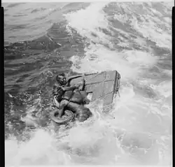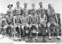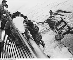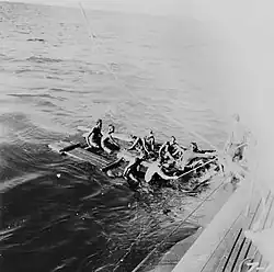 - ↑ Niektórzy ocalali jeńcy twierdzili, że rankiem 14 września słyszeli odgłosy strzałów z broni maszynowej dochodzące z kierunku, w którym odpłynęły szalupy. Przypuszczali, że grupa, w której znajdowali się Varley i Melton, mogła zostać odnaleziona i wymordowana przez jeden z japońskich okrętów. Ze względu na brak jakichkolwiek dowodów nie jest jednak możliwe potwierdzenie tych przypuszczeń. Nie jest przy tym wykluczone, iż tym, co słyszeli ocalali, był w rzeczywistości ogień okrętowej artylerii przeciwlotniczej. Patrz: Sturma 2021 ↓, s. 35, 37.