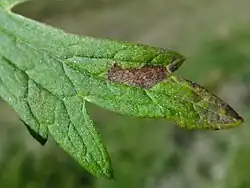 ![]() Plamy na dolnej stronie listka jaskra ostrego | |