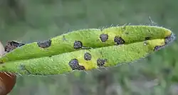 ![]() Wywołane przez Ramularia echii plamy na dolnej stronie liścia żmijowca zwyczajnego | |