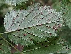 ![]() Wywołane przez Ramularia ulmariae plamy na górnej stronie listka wiązówki błotnej | |