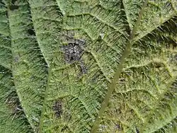 ![]() Plamy spowodowane przez R. urticae na górnej stronie liścia pokrzywy zwyczajnej | |