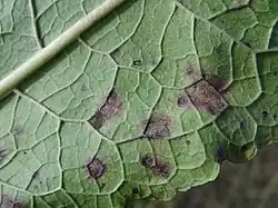 ![]() Wywołane przez Ramularia variablis plamy na górnej stronie liścia dziewanny pospolitej | |