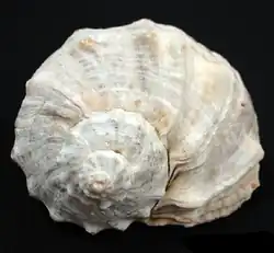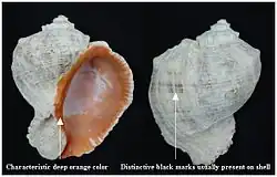 Muszla duża, ciężka, grubościenna (wysokość: 70–180 mm), z niewysoką, stopniowaną skrętką[4][5]. Ostatni skręt duży, mocno rozdęty, owalny. Ujście odsłania wnętrze muszli o charakterystycznym jaskrawopomarańczowym kolorze i takąż, szeroką i gładką kolumellę. Na powierzchni zewnętrznej muszli do trzech guzkowanych, spiralnych wstęg i delikatne żyłkowanie. Dołek osiowy odkryty, głęboki. Wokół dołka osiowego odkłada się łuskowata krawędź wyznaczająca położenie rynien syfonalnych ze wcześniejszych stadiów rozwoju ontogenetycznego (fasciola). Wieczko konchiolinowe. Barwa muszli zróżnicowana, dominują kolory beżowe, szare i brązowe z ciemnobrązowymi plamkami na żebrach. Niektóre osobniki maja muszle białe, bez guzów i ornamentacji[2][6].