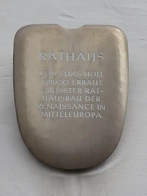 Ratusz wzniesiony został na miejscu starego, gotyckiego. Budowę rozpoczęto w 1615 roku pod kierownictwem Eliasa Holla. Pierwsze posiedzenie rady miejskiej odbyło się już w 1620, mimo że budynek w pełni ukończony został cztery lata później. Podczas nalotów alianckich w nocy z 26 na 27 lutego 1944 roku został doszczętnie zniszczony. Fasadę odbudowano w 1955, w 1962 oddano do użytku Złotą Salę, pozostałe pomieszczenia odbudowano w latach 1980–1984, jednak prace trwały jeszcze do 1990 roku.