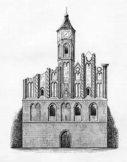 Pozostałości gotyckiego ratusza usytuowane są w bloku zabudowy śródrynkowej[1]. Nad całością wznosi się ośmioboczna wieża, na jej najwyższej kondygnacji widnieje tarcza zegarowa[1]. Wieża nakryta jest ośmiopołaciowym dachem namiotowym z czerwonej dachówki, zwieńczonym sterczyną[4]. Wewnątrz wieży są zawieszone dwa dzwony: jeden pochodzi z 1553 roku, a drugi z 1554[4]. Poniżej wieży zachowały się fragmenty gotyckiego szczytu podzielonego lizenami, ozdobionego blendami i wimpergami[4].