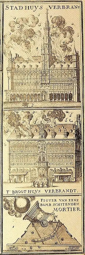 W 1695, podczas próby wyparcia z miasta sił Ligi Augsburskiej, wojska François de Neufville – księcia Villeroi zbombardowały Brukselę, a ratusz padł ofiarą pożaru, który strawił niemal w całości dawne wnętrza. Spłonęły dzieła sztuki – m.in. cykle obrazów Rogiera van der Weyden, które artysta namalował dla sali ławniczej; ogień spustoszył również zbiory archiwalne. Ocalały elewacje zewnętrzne wraz z wieżą i większością rzeźb.