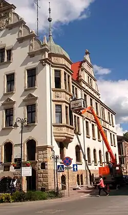 Pod oknem płytkiego wykusza wieży, na banderoli, umieszczono daty budowy ratusza (1904-1905)[20].