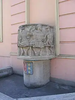 W zamkniętej półkoliście i ujętej w boniowane obramowanie wnęce znajdującej się pośrodku szczytowej elewacji ratusza, ustawiona jest fontanna, składająca się z pięciobocznego basenu ze stojącym pośrodku walcowatym trzonem z herbem miasta. Trzon zwieńczony jest czaszą w kształcie półwalca udekorowaną płaskorzeźbą przedstawiającą siedzących na wspólnej ławie i ucztujących mieszczan w renesansowych strojach. Fontanna wykonana jest z wapienia muszlowego[2].