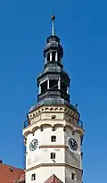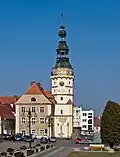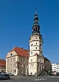 Ratusz jest renesansowym budynkiem wzniesionym na planie prostokąta, posiada trzy kondygnacje i jest nakryty dachem naczółkowym[1]. Do bryły dostawiona jest okazała, sześciokondygnacyjna wieża, w dolnej części czworoboczna, od trzeciej kondygnacji ośmioboczna, zwieńczona renesansowym hełmem z podwójną glorietą[1]. Nasadę hełmu obiega galeryjka z metalową balustradą, wsparta na arkadowych konsolach[1]. Wejście do wieży prowadzi przez dwubiegowe schody, powstałe w czasie dziewiętnastowiecznej przebudowy ratusza[1]. Wtedy też renesansowy szczyt zastąpiono naczółkowymi półszczytami z półkolistymi okienkami[1]. W południowo-wschodnim narożniku znajduje się pochodzący z XIV wieku zegar słoneczny, przeniesiony na ratusz w roku 1827 z kaplicy zamkowej[3]. Jak głosi legenda zegar został wykonany przez szwajcarskiego uczonego Paracelsusa[3].