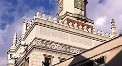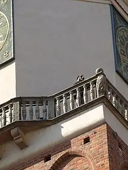 Attykę zdobi poczet królów z dynastii Jagiellonów od Władysława II Jagiełły i Jadwigi Andegaweńskiej po Zygmunta II Augusta. Na osi symetrii znajduje się wieżyczka z zegarem połączonym z mechanizmem koziołków. Pod nim znajduje się monogram Stanisława Augusta Poniatowskiego.
