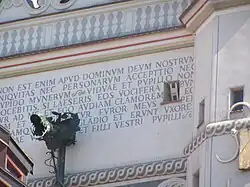 | FACITE IUDICIUM ET JUSTITIAM VI OPRESSUM LIBERATE DE MANU CALUMNIANTIS ADVENAM PUPILUM VIDUAM NOLITE CONTRISTARE NEC POTENTIA TURPITER NEC METU RECTUM JUDICIUM REFRINGATUR. | Czyńcie sąd i sprawiedliwość siłą uciśnionego i uwalniajcie z ręki potwarcy. Przybysza, sieroty, wdowy nie zasmucajcie. Ani moc, ani strach niech nie powstrzymują haniebnie słusznego sądu. |