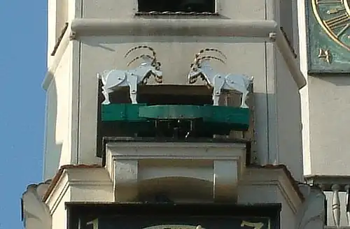 Gdy mistrz ślusarski Bartłomiej ukończył swój zegar i miał go zaprezentować radzie miasta oraz wojewodzie, którego również zainteresowała ta uroczystość, miano jakoby wydać ucztę ku czci możnych panów. Podczas przygotowań do uczty nieuważny kuchcik spalił sarnią pieczeń, a nie chcąc, aby błąd wyszedł na jaw, ukradł na podmiejskiej łące dwa młode koziołki. Nie udało mu się jednak sprawy zatuszować, gdyż koziołki uciekły z kuchni i wbiegły na ratuszową wieżę. Ku uciesze gości zaczęły trykać się rogami (według jednej z wersji zwróciły uwagę zgromadzonych na malutki pożar, od którego mogło spłonąć miasto). Rozbawiony wojewoda darował winę kuchcikowi, koziołkom życie, a mistrzowi Bartłomiejowi nakazał dołączyć do mechanizmu owo „urządzenie błazeńskie”.