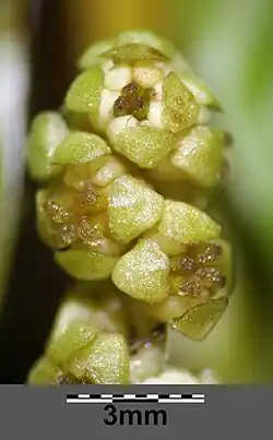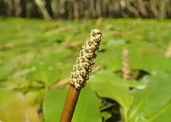 - Zebrane w kłosy na sztywnych szypułach, górą znacznie zgrubiałych (są około dwukrotnie grubsze od łodygi)[8]. Powstają tuż pod powierzchnią wody, ale podczas kwitnienia wyrastają tuż nad powierzchnię. Ich wynurzanie się następuje wskutek powiększania się podczas dojrzewania przestworów międzykomórkowych[9].