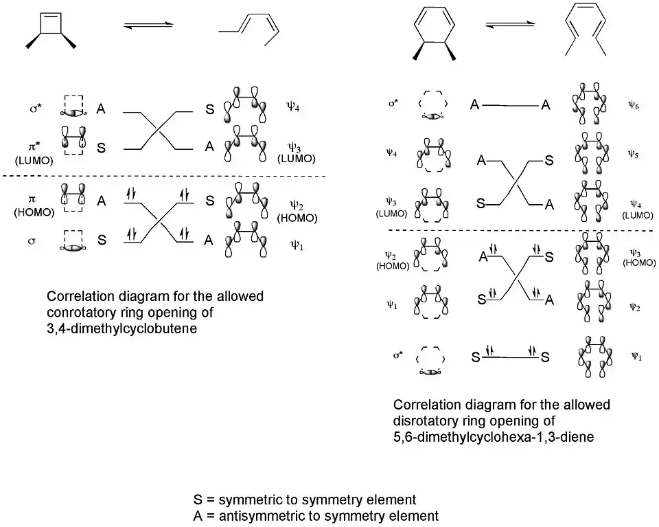 Do opisu reakcji elektrocyklicznych można wykorzystać diagramy korelacyjne, bazujące na symetrii orbitali molekularnych. Dla otwarcia pierścienia cyklobutenowego można za ich pomocą wykazać, że proces może zachodzić konrotacyjnie natomiast nie może zachodzić dysrotacyjnie. Jest to spowadowane faktem, że jedynie mechanizm konrotacyjny pozwala na maksymalne nakładanie się orbitali w stanie przejściowym. Ponadto powstający produkt jest wtedy w stanie podstawowym a nie wzbudzonym.