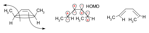 Klasycznym przykładem takiej reakcji jest indukowane termicznie otwarcie pierścienia 3,4 -dimetylocyklobutenowego. Izomer cis ulega przekształceniu do cis,trans-2,4-heksadienu natomiast z izomeru trans powstaje trans,trans-2,4-heksadien[2]: