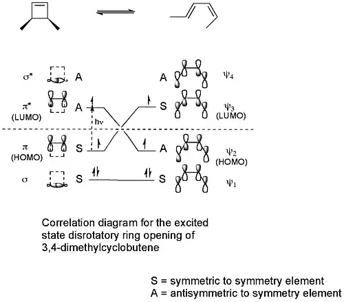 Jeżeli otwarcie pierścienia w 3,4-dimetylocyklobutanie jest indukowane fotochemicznie to mechanizm reakcji jest dysrotacyjny, co zostało zilustrowane na poniższym diagramie korelacyjnym: