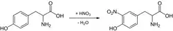 Reakcję przeprowadza się dodając niewielką ilość stężonego kwasu azotowego do badanej próbki, w postaci ciała stałego lub roztworu. Następnie mieszaninę ogrzewa się przez 2–3 min. W przypadku pozytywnego wyniku próbka staje się cytrynowożółta. Potraktowanie takiej próbki wodą amoniakalną powoduje zmianę barwy z żółtej na pomarańczową[3].