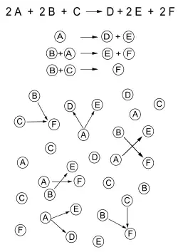- A + B → E + F,