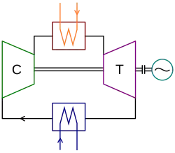 Obieg Braytona-Joule’a wykorzystuje gazowy czynnik roboczy, którym może być hel, azot lub dwutlenek węgla. Gaz roboczy o wysokim ciśnieniu ulega rozprężeniu w turbinie generującej energię elektryczną. Rozprężony, ciepły gaz jest chłodzony w chłodnicy, a następnie przechodzi do sprężarki, gdzie sprężany jest do ciśnienia roboczego systemu. Często turbina i sprężarka są mechanicznie sprzężone ze sobą pojedynczym wałem[31]. Oczekuje się, że wysokociśnieniowe turbiny z obiegiem Barytona będą miały mniejsze gabaryty niż pracujące w niższych ciśnieniach turbiny obiegu Rankine’a. Maszyna termiczna cyklu Braytona może też pracować w niższych ciśnieniach przy poszerzonych przekrojach instalacji[31]. Pierwszy na świecie użytkowy moduł cyklu Braytona zbudowano i zastosowano w siłowni słonecznej 100 kW na izraelskiej pustyni Arava w 2009 roku[32].