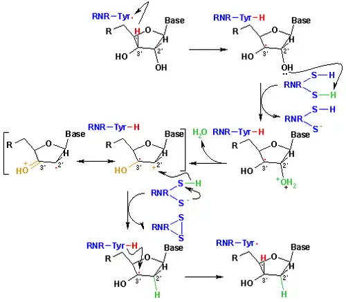 Prowadzi on redukcję difosforanów nukleozydów do difosforanów deoksyrybonukleozydów. Równoważników redukcyjnych dostarcza zredukowana tioredoksyna, która utlenia się w tej reakcji. Musi ona zostać następnie zredukowana (reakcję tę z kolei katalizuje reduktaza tioredoksynowa), używająca z kolei NADPH[1].