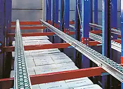 W regałach przepływowych (ang. pallet live storage) palety ładowane są na regał w strefie załadowczej, a następnie – na rolkach, siłą grawitacji – przesuwają się w głąb regału i dalej na jego przeciwległy koniec do strefy odbiorczej[8]. Stosowane są tam, gdzie nie jest konieczne zachowanie FIFO, lecz gdzie duża ilość towaru musi zostać rozmieszczona na małej powierzchni[9].
