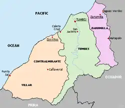 Region Tumbes podzielony jest na trzy prowincje, które obejmują 13 dystrykty.