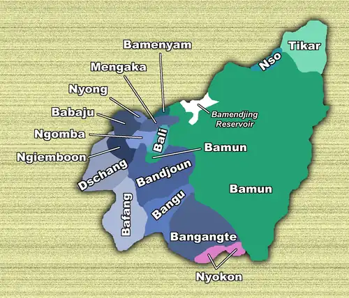 Region jest podzielony na osiem departamentów: Bamboutos ze stolicą w Mbouda, Haut-Nkam ze stolicą w Bafang, Hauts-Plateaux ze stolicą w Baham, Koung-Khi ze stolicą w Bandjoun, Menoua ze stolicą w Dschang, Mifi ze stolicą w Bafoussam, Ndé ze stolicą w Bangangté i Noun ze stolicą w Foumban. Na czele regionu stoi mianowany przez prezydenta gubernator. Na czele departamentu stoi, także mianowany przez prezydenta, prefekt.
