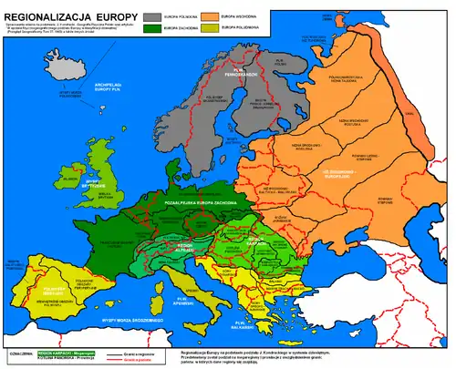 Autorzy pięciotomowej polskiej "Geografii powszechnej" z 1965 roku wydzielili następujące wielkie krainy geograficzne Europy: