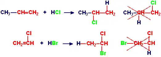 W reakcji tej atom wodoru przyłącza się chętnie do tego z dwóch atomów węgla, połączonych wcześniej wiązaniem podwójnym, do którego już wcześniej było przyłączone więcej atomów wodoru.