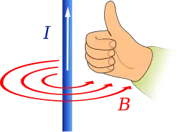 W fizyce druga forma reguły prawej dłoni określa regułę, w myśl której jeśli prawą dłonią obejmiemy przewodnik elektryczny tak, że kciuk wskazuje kierunek przepływu prądu elektrycznego w przewodniku, to zgięte pozostałe palce wskażą kierunek i zwrot wektora indukcji magnetycznej[1]