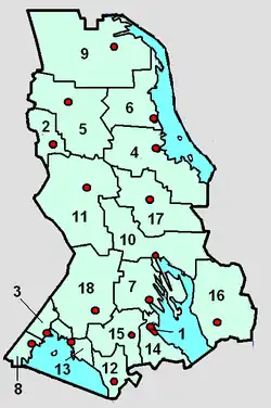 Czerwony punkt na terenie rejonu pokazuje lokalizację ośrodka administracyjnego