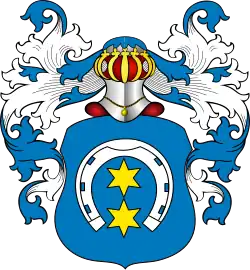 W polu błękitnym podkowa srebrna, z dwiema gwiazdami złotymi w słup między ocelami Klejnot nieznany, na hełmie brak korony. Labry błękitne, podbite srebrem.