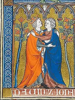 - relacja związku Dawida i Jonatana (2 Księga Samuela) według niektórych jest przykładem miłości między dwoma mężczyznami. W Biblii Tysiąclecia można znaleźć: „Dusza Jonatana przylgnęła całkowicie do duszy Dawida. Pokochał go Jonatan tak jak samego siebie”. Dawid po śmierci umiłowanego Jonatana wznosił żałobne pieśni według Biblii Gdańskiej: „Żal mi ciebie, mój bracie, Jonatanie. Tak bardzo byłeś mi drogi! Więcej ceniłem twą miłość niżeli miłość kobiet”, a według innego tłumaczenia z Biblii Tysiąclecia: „Żal mi ciebie, bracie mój, Jonatanie, byłeś mi bardzo miły. Miłość twoja była mi rozkoszniejsza niż miłość kobiety”. Nie mniej interpretacje miłosnej relacji Dawida i Jonatana odrzuca większość biblioznawców, interpretując ją jako bardzo bliską przyjaźń, ale bez seksualnych podtekstów.