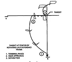 Układ współrzędnych (na rysunku z lewej strony) przedstawia współrzędną R-bar[6] łączącą środek Ziemi, z ISS (na wykresie oznaczony jako TARGET), plusem skierowaną do środka ziemi. Współrzędna V-bar[7] jest styczną do orbity ISS, dodatnią w kierunku jej obrotu i prostopadłą do współrzędnej R-bar. Po zakończeniu manewru RPM (punkt 1 na układzie współrzędnych), wahadłowiec wykonywał zmianę kąta pochylenia o 90° podnosząc dziób do góry w tempie 0,1° na sekundę[5]. Jednocześnie silniki systemu sterowania reakcyjnego ustawiały wahadłowiec tak, aby w momencie kiedy będzie skierowany ogonem w kierunku Ziemi, otwarta skrzynia ładunkowa wskazywała wyznaczony port dokowania stacji ISS (APAS-95 strona bierna) (punkt 2), a prędkość wznoszenia zmniejszyła się do zera. Port dokowania promu APAS-95 (strona aktywna) znajdował się we wnęce ładunkowej promu. Jeżeli założymy, że przód ISS to strona zwrócona w kierunku poruszania się w ruchu orbitalnym, to tak ustawiony prom (punkt 2) znajdował z przodu ISS. W tym miejscu znajdował się początek etapu, w którym wahadłowiec poruszał się według osi V-bar. Na początku trasy promu według osi V-bar prędkość wahadłowca w ruchu orbitalnym początkowo nieznacznie malała (hamowanie silnikami RCS), co rozpoczynało zbliżanie się wahadłowca do portu dokowania ISS. W ostatniej fazie dokowania, prędkość wahadłowca względem ISS stopniowo malała tak, aby w momencie spotkania równała się zeru (była zbliżona do zera)[8].