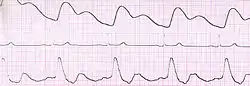 Przebiegi (patrząc od góry) przedstawiają odpowiednio: zmiany badanej impedancji w czasie, zapis EKG z II odprowadzenia kończynowego Einthovena, oraz pochodną impedancji po czasie ()