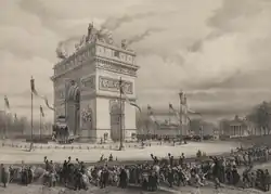 W oddali można było zobaczyć powolny, pośród pary i słońca, na szarym i czerwonym tle Champs-Élysées, wysokie białe statuy przypominające fantomy, rodzaj złotej góry. Nie można było jednak dostrzec niczego, ale swego rodzaju połyskujące światło sprawiło, że cała powierzchnia konduktu spowijała się to blaskiem gwiazd, to rozbłyskiem pioruna. Ogromny objął tę zjawę szmer.
