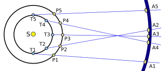 A1, A2... A5 – obserwowana pozycja planety na sferze niebieskiej