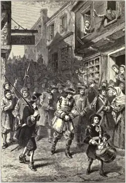 - ↑ Zgodnie z kalendarzem juliańskim, będącym w użyciu w tym czasie w Anglii i jej koloniach, nowy rok rozpoczynał się 25 marca. By uniknąć pomyłek w datowaniu w porównaniu z kalendarzem gregoriańskim używanym (poza Rosją) w całej Europie, daty pomiędzy 1 stycznia i 25 marca były czasem podawane dwojako.