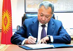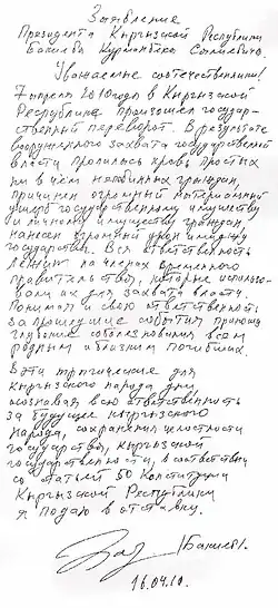 - ↑ Kyrgyz president formally resigns after turmoil. Reuters, 16 kwietnia 2010. [dostęp 2010-04-16]. (ang.).