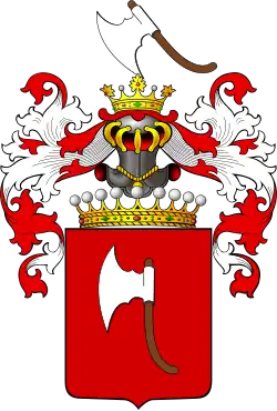 W polu czerwonym oksza. Nad tarczą korona hrabiowska, nad którą hełm z klejnotem: oksza wbita w hełm w skos. Labry czerwone, podbite srebrem.