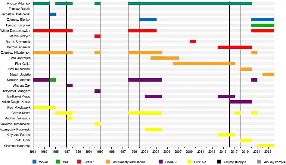 - Andrzej Adamiak (zm. 2020) – śpiew, gitara basowa (1981/2–1984, 1985–1988, 1992–1993, 1998–2020)