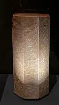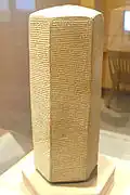 British Museum | BM 91032 | wys. 38 cm; szer max. 16, 51 cm, szer. boków 8,57 cm[1]. | Wykonana z czerwonej gliny. Boki zawierają 82 + 83 + 82 + 80 + 85 + 75 linijek tekstu[1]. |